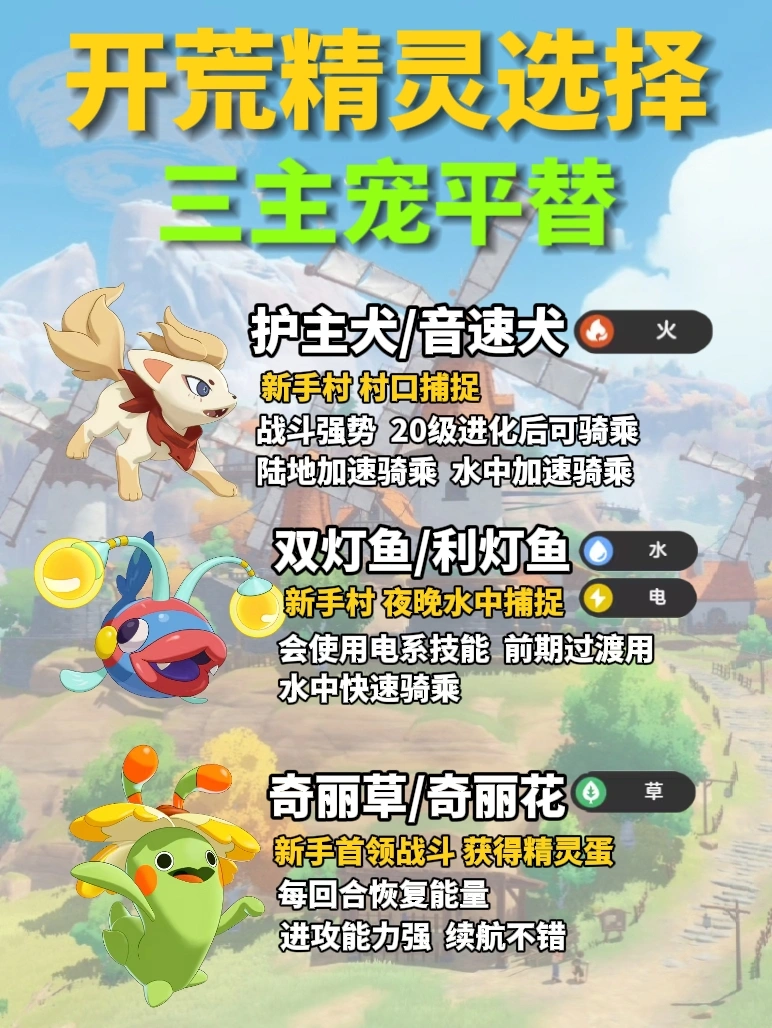 御三家建议选火花,开荒和战斗比较强,当然选其他的也可以,音速犬可以平替,但是火花进化后的火神可以进雪山探索,骑乘时可以帮洛克取暖,不然洛克在雪山容易被冻僵扣生命值。