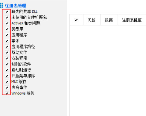 2、选择需要修复的注册表类型,一般情况下直接全部选中即可。