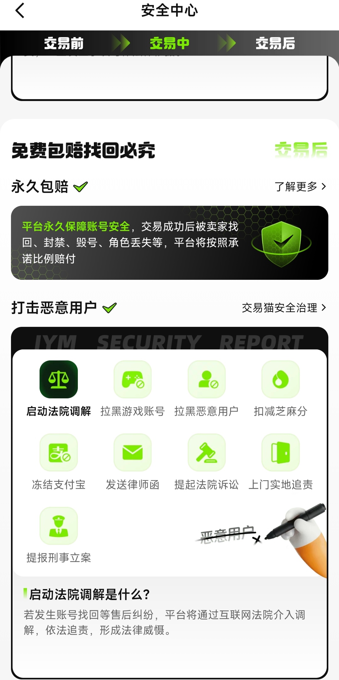 所有《和平精英》账号交易均纳入“永久包赔”服务体系——若发生非用户操作导致的账号异常,平台将依据协议启动赔付流程。针对恶意找回、虚假描述等违规行为,联合互联网法院建立司法协同机制,实现纠纷在线调解、证据固化及依法追责,显著提升违法成本,切实保护买卖双方合法权益。
