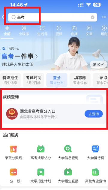 第一步:启动支付宝APP后,在顶部搜索栏输入【高考】关键词,进入专题页面后即可看到成绩查询入口。