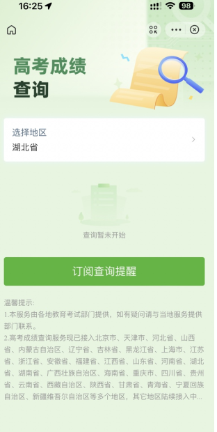 需要注意的是,当前成绩查询功能尚未开放,考生需耐心等待官方公布成绩后再进行操作。