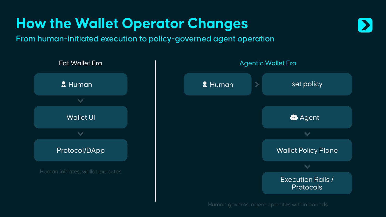 答案不在两个极端。完全自主是 Agent 时代最性感的叙事,但维纳的警告依然成立。我们认为,Agentic Wallet 必须同时服务两类主体:一方面为人类提供规则设定、风险控制与治理干预能力;另一方面为 Agent 提供受约束的执行权限,使其能够在明确边界内自主完成链上操作。换言之,钱袋需要从人类使用的资产容器与签名工具,演变成一套让人设定边界、让 Agent 在边界内行动的权限与执行系统。