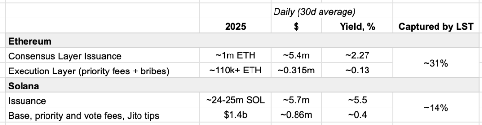 以太坊的质押收益主要来自网络通胀,每日最大增发量约 2700 枚 ETH,2025 年总计约 100 万枚 ETH;Solana 的年度增发量约 2400-2500 万枚 SOL。这类收益的优势在于稳定性强,但本金价格波动较大。