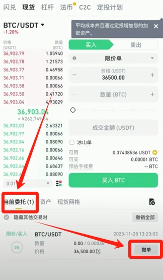 将USDT从资金账户划转至现货账户后,即可在行情页面进行比特币买卖操作。