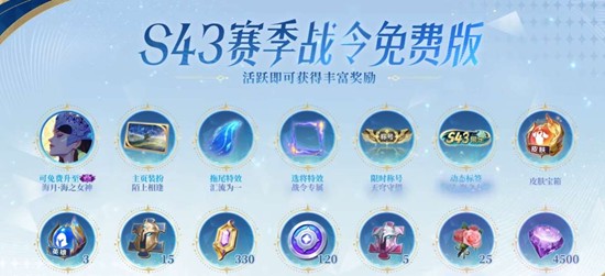 本次战令的最大亮点在于提供两款史诗品质皮肤。进阶版30级可领取后羿-天穹守望者史诗皮肤,而海月-海之女神更是可在免费版5级获取勇者形态后,通过进阶版在40级时将其升级为史诗品质。这意味着188点券即可获得两款带"S43限定"标签的史诗皮肤,打破了以往战令仅提供一史诗一勇者的常规配置,海月皮肤更是首次在免费版中提供可进阶至史诗的奖励。