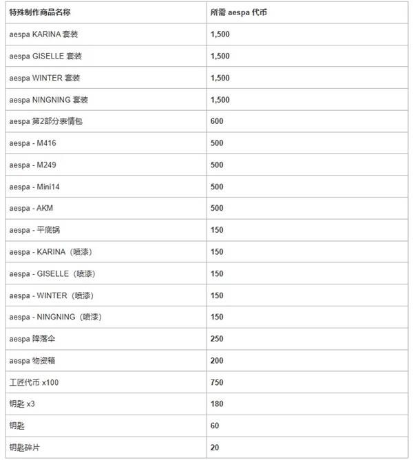 工坊中添加了可特殊制作的 aespa 套装、武器皮肤、表情包和喷漆等道具。