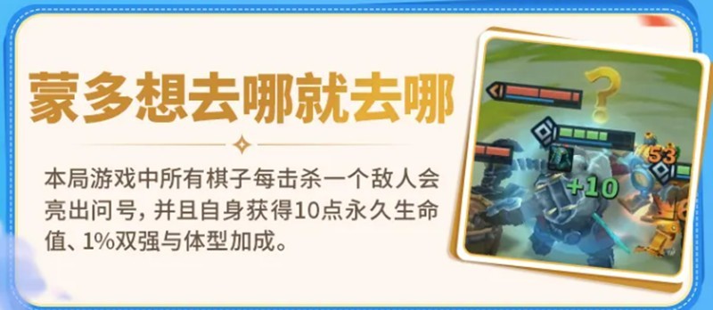 蒙多的效果是一个全局生效的机制。所有友方棋子每击杀一个敌人,就会永久获得10点生命值、1%的双抗加成,并且体型会略微变大,头顶还会显示一个问号标识。这个效果有很强的滚雪球能力,前期如果能保持连胜,击杀频率高,就能快速积累属性,让棋子的单体强度在中后期得到指数级的提升。因此,尽量通过稳定的连胜来维持击杀节奏,最大化这个增益的叠加效率。