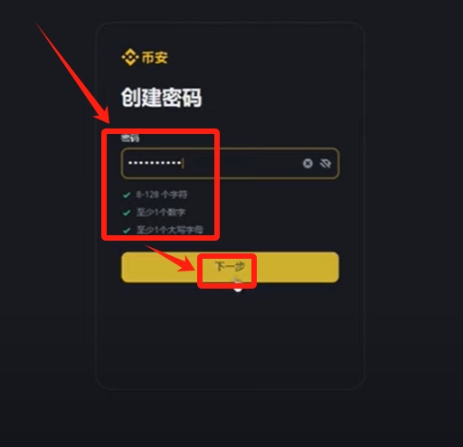 创建密码时需满足三项安全要求:8-128个字符、包含至少一个数字和一个大写字母。系统会实时检测密码强度,未达标项目会显示提醒。设置完成后点击【下一步】。