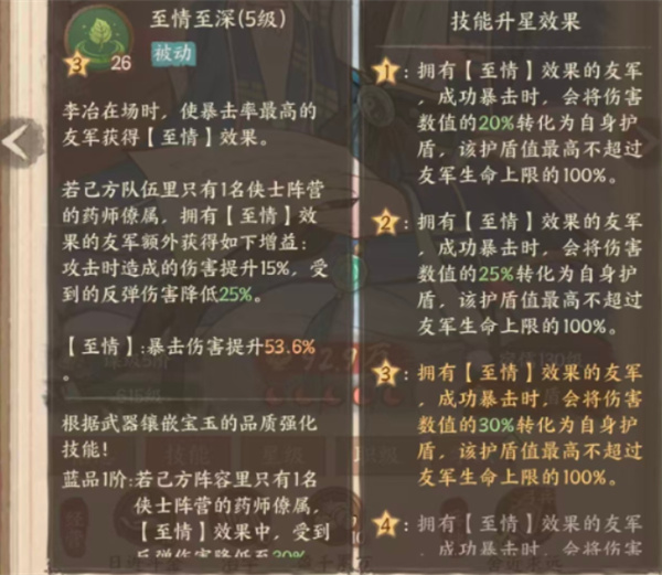 效果:为我方攻击最高的主C添加【至情】标记,提升其暴击伤害和攻击力。当队伍中只有她一个侠士药师时,会提供额外的增伤。