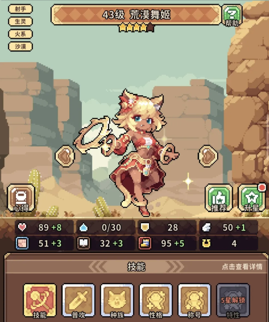 第二位是「荒漠舞姬」,别名火猫、舞娘。她虽属射手职业,但核心价值在于鼓舞机制——每次投掷回旋镖可叠加5层鼓舞,大幅提升全队攻速与暴击率。该效果使其成为鼓舞流体系的核心启动点。此外,她可装备眩晕类射手专属装备,进一步强化控制链与节奏压制能力,在需要持续增益或破防的关卡中表现突出。