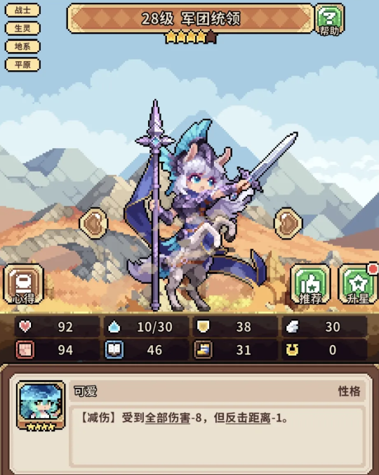 第三位为「军团统领」(俗称人马)。作为前排战士,她兼具治疗与鼓舞双重功能:战斗中可为友方恢复生命并附加鼓舞状态。满星后解锁“优先行动”机制,显著提升高难副本应对能力。即使未满星,其基础治疗量与鼓舞覆盖率也足以承担副C或功能型前排职责。装备选择空间广,兼容多种流派,整体容错率与阵容适配性均属上乘。