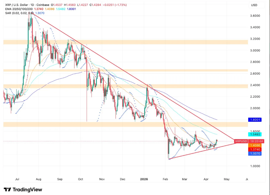 4月17日XRP报1.4284美元,日内跌幅1.73%但周线仍保持6.4%涨幅。该代币同期表现超越比特币、以太坊及BNB,行情走势显示出自3.80美元高位形成的下降楔形确认突破,目前价格稳居20日与50日指数移动均线上方,短期动能强劲。1.3070美元抛物转向指标构成当前区间下方支撑基础。