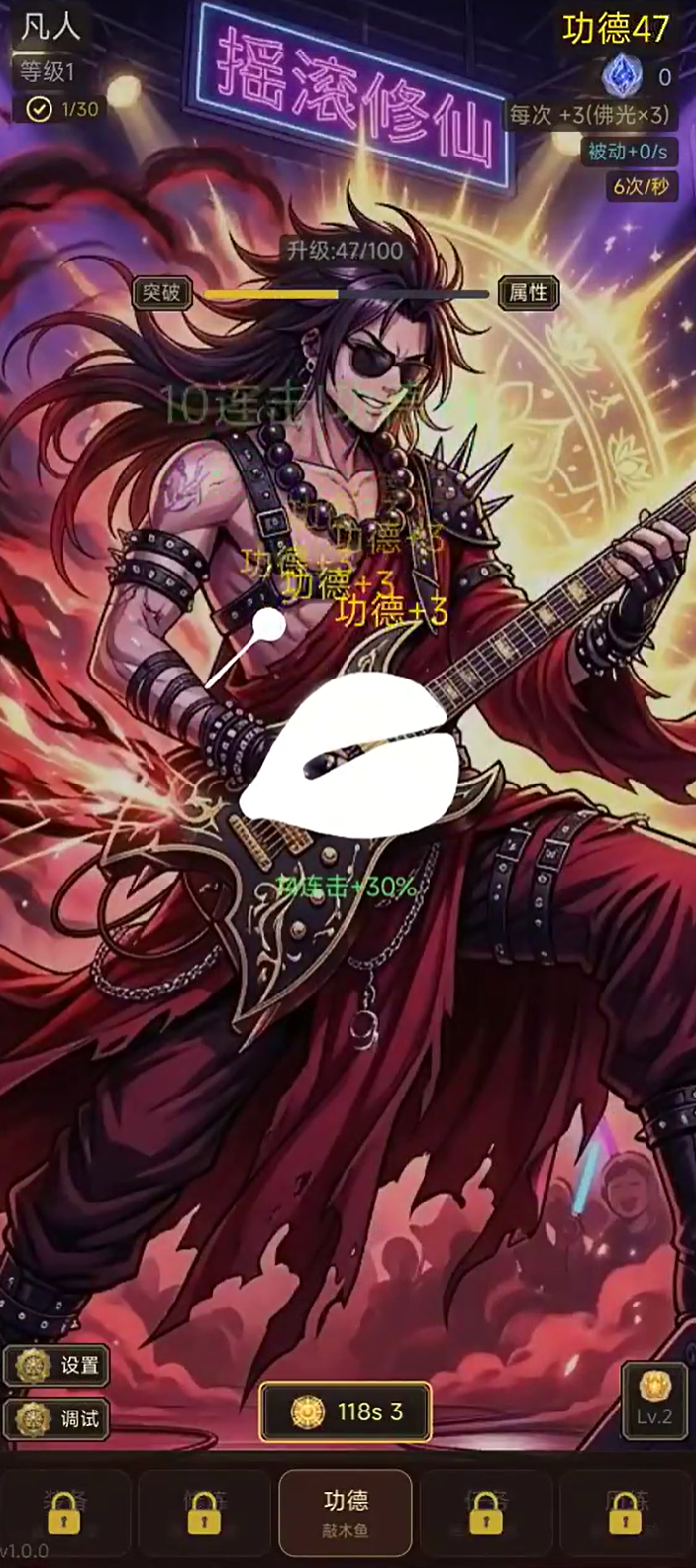 游戏核心机制围绕“敲木鱼”展开:玩家通过点击屏幕完成敲击动作,每次操作均可累积功德值。所获功德既可用于净化角色身上的煞气,亦可转化为修为与等级成长的关键资源。值得一提的是,本作配乐融合现代摇滚元素,节奏感鲜明,使重复性操作更具韵律趣味,契合碎片化放松需求。