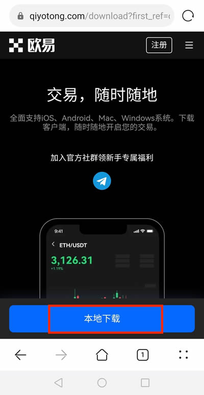 安卓设备安装指引:访问官网点击下载按钮,使用浏览器扫描二维码(微信扫码可能出现拦截),选择【本地下载】完成安装流程。