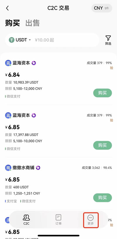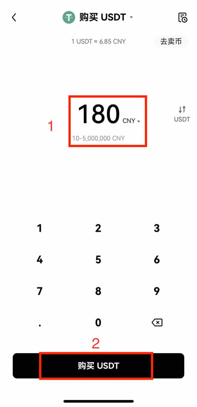 购得的USDT需从【资金账户】转入【交易账户】方可进行币币交易。