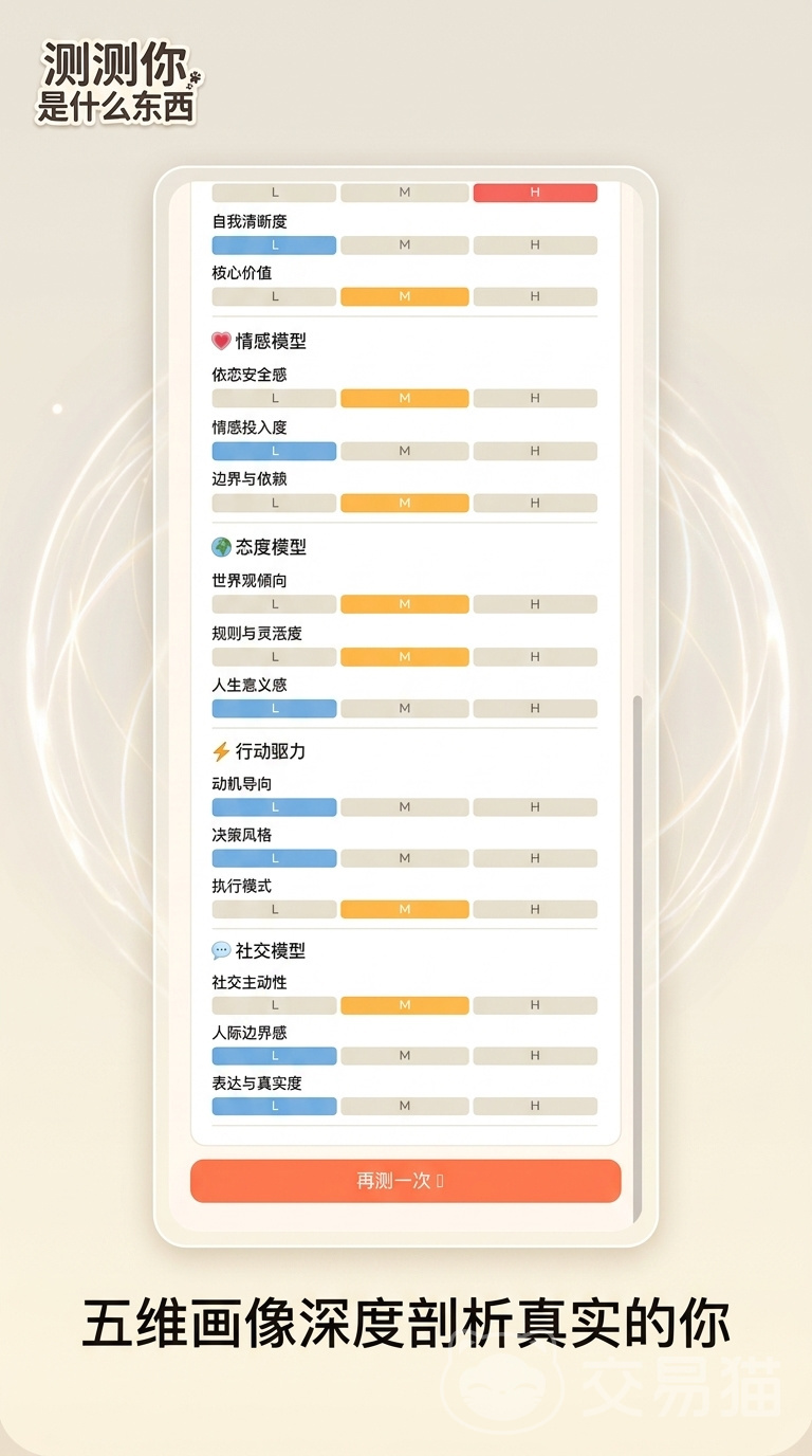 该作摒弃传统角色养成与复杂剧情结构,主打“即开即测、即测即享”的碎片化体验。全程无需注册账号,无体力限制,无等级压制,单局测试平均耗时约60秒,适配通勤、课间、午休等短时场景。题库内容聚焦日常生活情境,以开放式选择题为主,强调直觉反馈而非逻辑推演,每道题目均无标准答案,强化个体表达自由度。