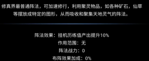 在金丹期之前,玩家主要通过基础挂机积累资源;进入金丹期后,阵法系统正式开放,可于主界面中央挂机入口处自由切换并部署阵型。每套阵法最多可同时激活六项独立效果,且所有阵法均需通过背包中的对应图纸进行进阶升级。其中,“巨石阵”作为神品级阵法,在前期具备显著优势:其核心机制为召唤天降巨石打击范围内敌人,并同步提升灵脉产出效率;该阵法可在元婴初期完成最终进阶,此后不可再升,属于稳定长效的初期核心配置,后期可搭配金色品质阵法形成复合体系。