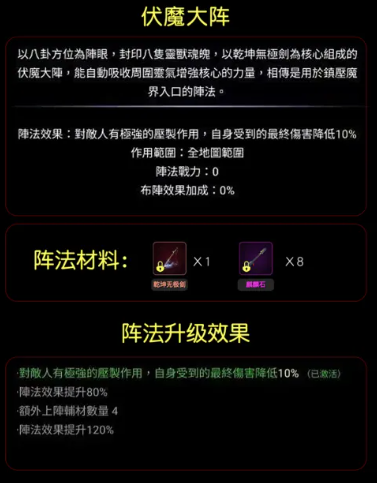 魔道路线则更适配伏魔大阵:该阵以八卦方位设阵眼,具备灵魂封印能力,对敌方施加强力压制;同时提供受击时10%伤害减免效果,且全图生效概率极高。颠倒五行阵每10秒触发一次“走火入魔”状态攻击,持续2秒,期间有1%几率造成10倍暴击伤害,属于高风险高回报的终结型辅助阵法。次元杀阵则每5秒生成一道空间裂隙,吸引6米内敌人并施加等同于当前法术攻击力的持续伤害,虽范围有限但爆发集中。