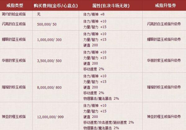 《地下城与勇士》中结婚戒指的属性根据等级不同属性也会有所变化。戒指是需要一步一步进行升级的,随着戒指等级的提升属性也会发生变化,具体如下。
