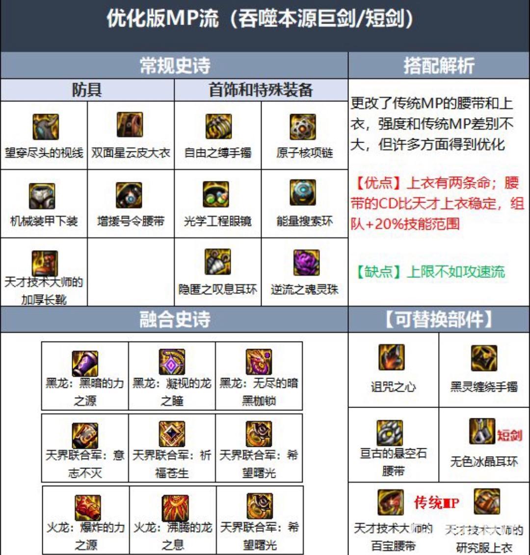一、搭配一:吞噬本源巨剑/短剑 望穿尽头的视线 双面星云上衣 机械下装 增援腰带 天才鞋 自由之缚手镯 原子核项链 能量搜索环 光学眼镜 隐匿耳环 逆流灵珠 【融合史诗】黑龙:黑暗的力之源 黑龙:凝视的龙之瞳 黑龙:无尽的暗黑枷锁。配装特点:更改了传统MP的腰带和上衣,强度和传统MP差别不大但许多方面得到优化。