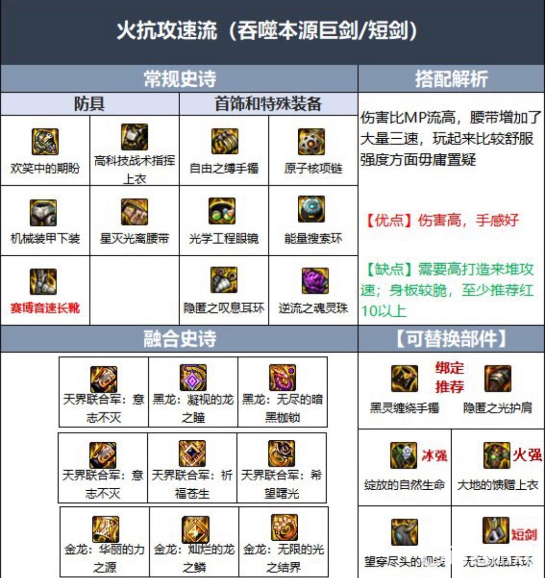 二、搭配二:吞噬本源巨剑/短剑 欢笑中的期盼 高科技上衣 机械下装 星灭腰带 赛博鞋 自由之缚手镯 原子核项链 能量搜索环 光学眼镜 隐匿耳环 逆流灵珠 【融合史诗】天界联合军:意志不灭 黑龙:凝视的龙之瞳 黑龙:无尽的暗黑枷锁。配装特点:伤害比MP流高,腰带增加了大量三速,玩起来比较舒服,强度方面毋庸置疑。