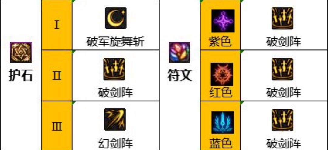 1、护石:破军炫舞斩、破剑阵、幻剑阵。符文:9保破剑阵