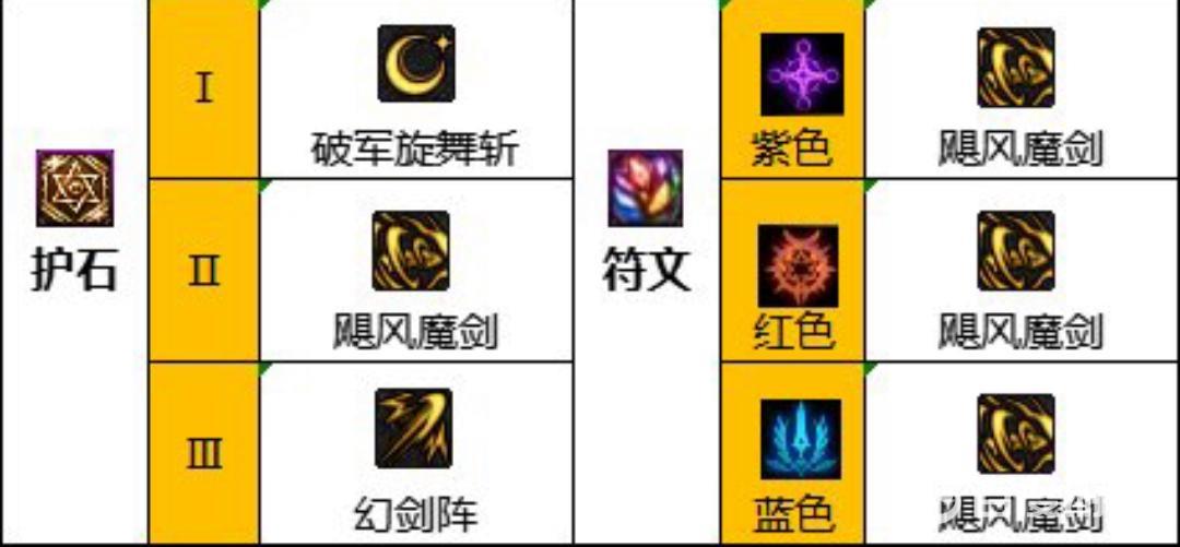 2、护石:破军炫舞斩、飓风魔剑、幻剑阵。符文:9保飓风魔剑。