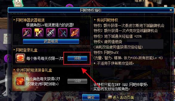 《地下城与勇士》游戏中网吧特权的疲劳药在特权网吧登录游戏后直接在游戏中可以领取,玩家登录游戏后选择角色进入,然后在血条上方点击“网吧特权”的功能入口,找到“网吧登录礼盒”点击领取,打开后就可以获得疲劳药了。