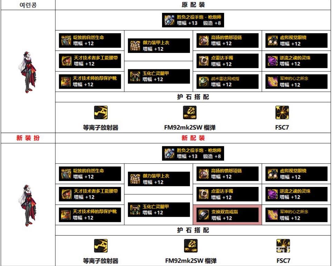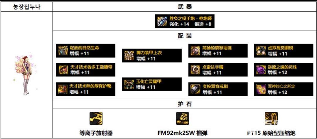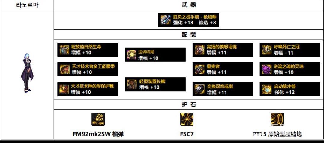 3、配装三:胜负之役手炮、绽放的自然生命、逆转结局、愤怒项链、呼唤死亡之冠、天才腰鞋、轻型装置长裤、重奏者、双音戒指、逆流灵珠、启动脉冲管。护石选择FM92mk2SW榴弹、FSC7、PT15原始型压缩炮。