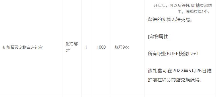 地下城与勇士最近更新了积分商城,其中限定商城出售初阶精灵宠物礼盒,开启后可以在9种宠物中选择一个,阶精灵宠物属性:所有职业BUFF技能Lv 1。