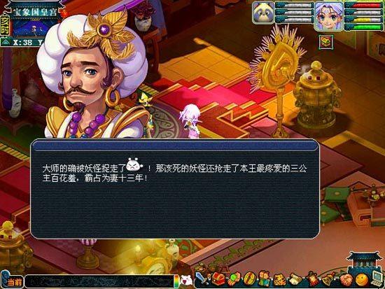 找宝象国找到宝象国国王(宝象国皇宫内34,34)打听,竟然看到玄奘大师也在宝象国作 客,询问之下得知原来玄奘被宝象国附近碗子山上的妖怪捉住了,全靠同被妖怪所俘的宝象国三公主相助才逃命出来,现在玄奘已派弟子猪八戒和孙悟空前往收妖救 公主出来,你一听觉得此妖怪或许跟奎木狼相关,便拜别国王和玄奘,前往碗子山找猪八戒孙悟空一探究竟。