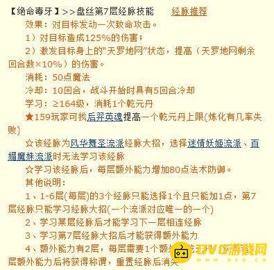 2.经脉:力盘丝在用中造成的伤害高除了自身的装备之外经脉方面也是有要求的,上面就是整理出来的盘丝洞力属性加点的一种经脉,其实最主要的还是前两个乾元丹,因为前两个经脉中有一个是可以提升天罗地网伤害,并且提升对拥有天罗地网状态角色的物理伤害的经脉,第二个就是提高天罗地网命中率的,这样的力盘丝在开始的时候可以先使用天罗地网进行群秒,后续再使用物理攻击进行点杀,叠加了天罗地网状态之后盘丝洞进行平砍能够造成的输出也非常高