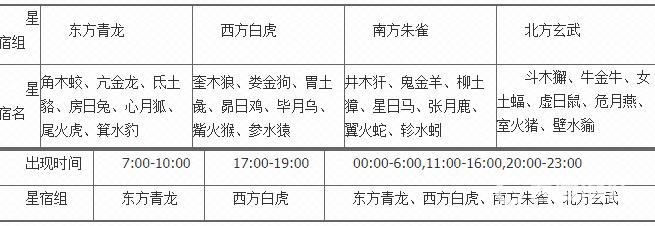 二十八星宿共分为4组:东方青龙组、南方朱雀组、西方白虎组、北方玄武组。星宿分组。
