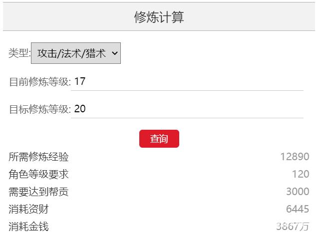 梦幻西游人物修炼17级到20级需要修炼经验12890点经验,攻击/法术/猎术修炼每10点经验需要3W,防御/法防修炼每10点经验需要2W,因此攻击/法术/猎术修炼17级到20级需要3867W,防御/法防修炼需要2578W。