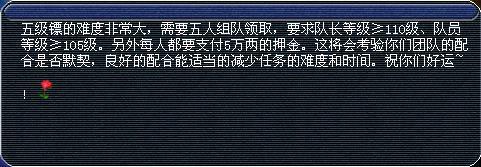 1.在镖局组队,推荐纯攻击系和法术系门派,而且最好5个人全是同一个门派的。(本人经常5个DT。这样的好处是打得快,每个人做完找人任务后可以直接回门派集合)队长要求110级以上,队员只需要105级就可以了,每个人身上要有5W本金,交给镖头。