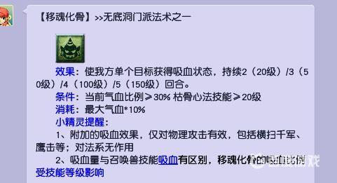 1.移魂化骨:消耗自身气血使目标获得吸血效果,持续一定回合。