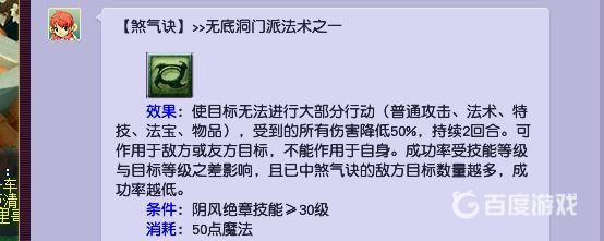 3.煞气诀:使目标一定回合无法做部分行动(禁止使用物理、法术、特技、法宝、物品),并且该目标不会受到攻击。可作用于敌人或队友,不能作用于自己。使用后2回合内降低自己的速度。成功率略低于夺魄令,敌方已被煞气诀封印的数量越多成功率越低。