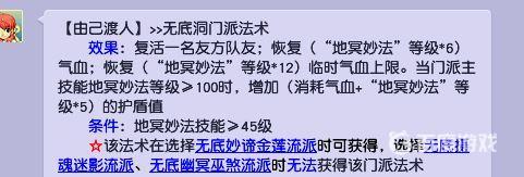 11.由己渡人:当门派主技能地冥妙法等级≥100时获得“复活时附加一个(消耗气血*1 “地冥妙法”等级*5)的护盾”附加效果