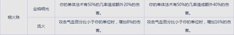 ①、业焰明光:1级效果,你的单体法术有50%的几率造成额外20%的伤害,2级效果,你的单体法术有50%的几率造成额外40%的伤害。