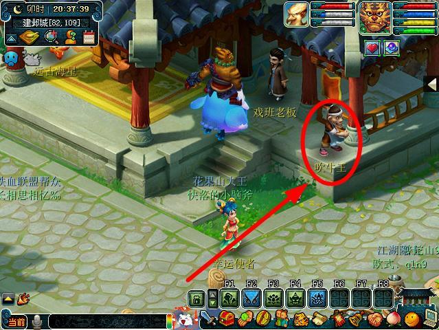 5、接着找“吹牛王”(建邺城90,111)就站在戏台旁边,到这里“失窃疑云”就完成。