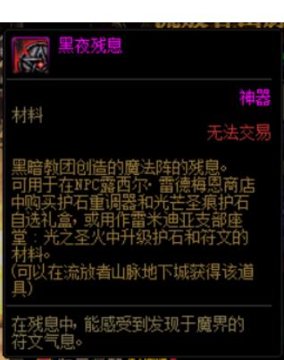 在游戏《地下城与勇士》中,玩家获得黑夜残息的方法是玩家可以在流放者山脉地下城中获得。黑夜残息的作用是玩家可以在露西尔商店购买护石重调器、或者用于升级魔界大战产出的护石和华丽的符文。