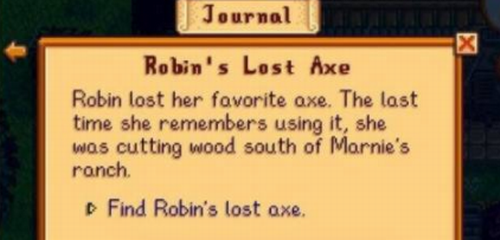 1、先看任务简介,里面说Robin最后一次使用斧头是在Marnie的牧场南边砍树,所以按照说明,去牧场南边的森林找就行了。