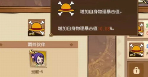 绿色羁绊的羁绊队友是【小玉】。绿色技能满级6级的状态下,增加自身物理暴击值10.08%。大家要知道,路飞太郎作为力量系前排、防御型装备的角色,适当增加暴击值,对于路飞太郎来说是合理的加强,在输出上会有比较明显的提升。我们从路飞太郎的大招技能可以看到,在进入弹力人状态后:路飞太郎提高100%暴击伤害。因此我们可以得出,羁绊作针对性加强有一定的必要。
