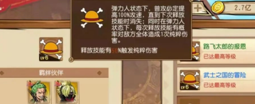 蓝色羁绊的羁绊队友是【佐罗十郎】、【山五郎】。从技能效果来看,满级6级羁绊技能,释放技能有50%概率对敌方全体造成1次纯粹伤害。路飞太郎开场不久应该能释放大招,进入弹力人状态;在弹力人状态下,释放技能顺序是:大招--狮子火箭炮--犀牛榴弹炮--普攻--狮子火箭炮--普攻--犀牛榴弹炮……直至第二次开大之前,弹力人状态下都是普攻后接着释放一次技能,只有大招后是连续两次释放技能。