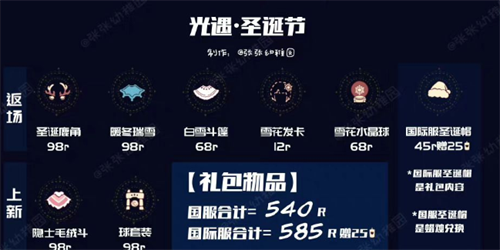 3、国服的礼包,主要有圣诞鹿角98元、暖冬瑞雪斗篷98元、白绒斗篷68元、雪花发卡12元、水晶球68元、白雪斗(隐士毛绒斗)98元、球套装(球门和球)98元。新旧一共七个礼包,价值540元。