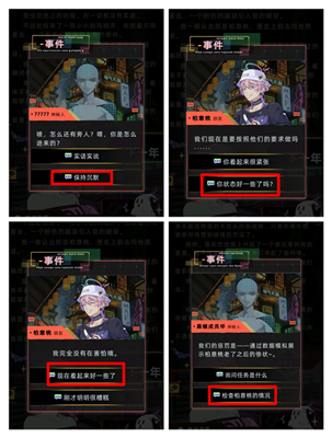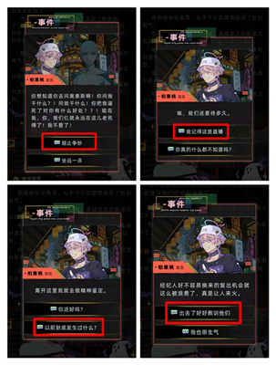 2.攻略:我将一些选项事件和我的选择放在了图片,其中方框为红色的,为支线1,剧情更多,时间也更长;方框为蓝色的,为支线2,剧情更少,时间更短,可以参照来选。