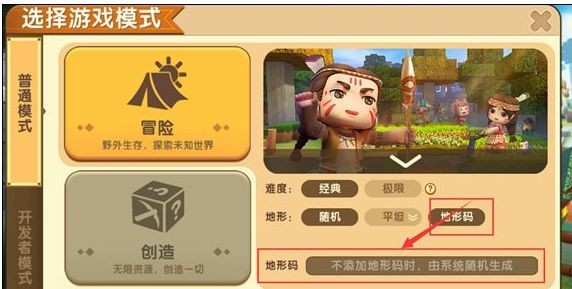 同时,玩家在选择模式的时候,你也可以自己进行设置,在难度的下面,你可以找到地形码的设置,如果你输入地形码,进入地图之后,就是你输入地形码的地图,如果不输入地形码,就是采用随机生成的方式,随机生成的方式,在游戏中你想要找自己需要的地形,还是比较困难的。