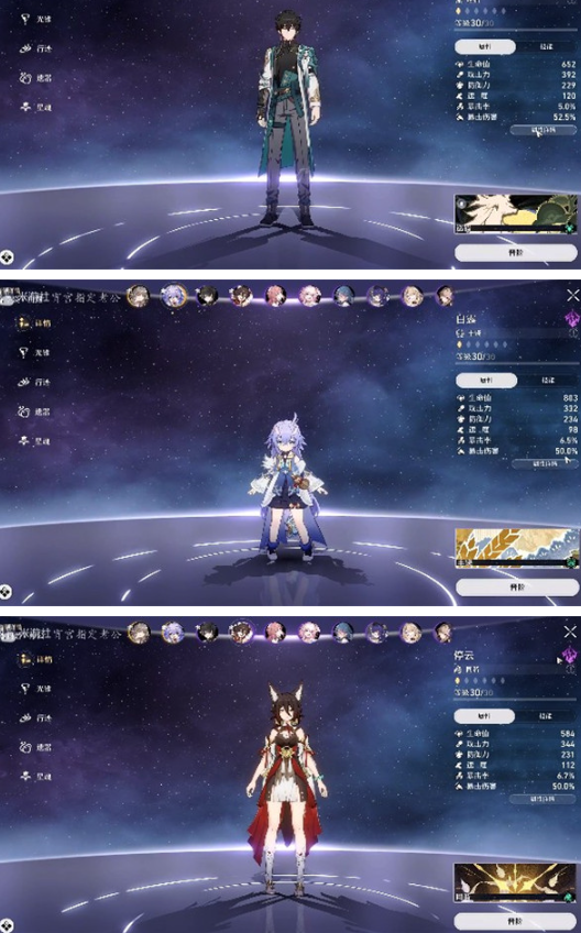 主角和丹恒双c都是初始送的,全队1金摆烂低配低练(遗物都没拉起来),停云作为一个攻击拐来增加主角和丹恒的伤害,白露作为奶妈保证生存,没有白露的玩家可以用娜塔莎或者三月七代替。
