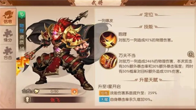 我们必须提到的武将就是刘备。刘备不仅是三国历史中的重要人物,而且也十分出色。他的技能描述中写道,“攻击敌方全体,使其防御降低,且有概率使敌方沦为混乱状态”,这就意味着消耗一定的怒气后,他可以对敌人造成大范围的伤害,同时还有可能使敌人陷入混乱状态,对手无法进行正常攻击,这对于攻防两方都有着极大的影响。而且刘备的生命值也非常高,能在战斗中坚持很久。