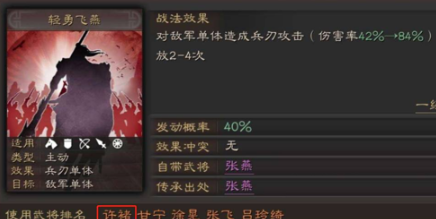 1、轻勇飞燕:这个战法可以对敌军造成多段伤害,而且这些多段攻击会集中在一个人身上,配合许褚的战法是非常好的,可以做到集火伤害最大化。